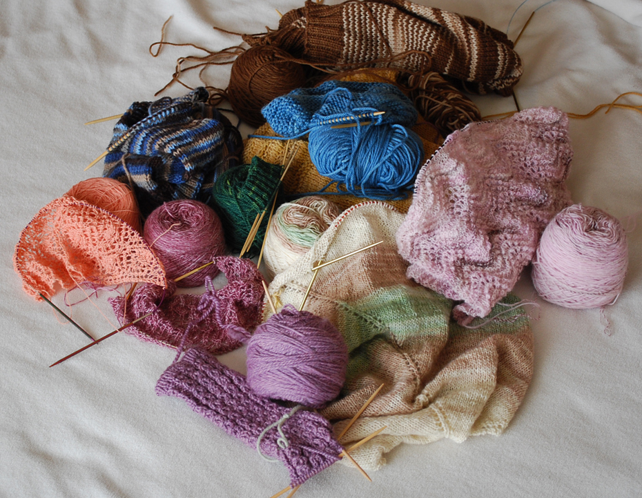Earlier today I decided to pull out all of my works in progress and take a good hard look at them. I am acquiring way too many unfinished or almost there projects for my liking these days. I intended to look at them all and see what was worth finishing and what was worth ripping out or frogging and putting the yarn towards another use. Once I had them all in a pile I suddenly felt rather embarrassed. I found myself asking, “Seriously, what is the matter with me? Do I have some sort of commitment phobia?!” Why am I getting to about the half way point on a pattern and then tossing it aside to start another pattern only to toss that one aside. Could it be a short attention span moves me from one pattern to yet another intriguing sounding pattern? I really cannot answer that tonight. Maybe I get sidetracked by life? Maybe the pattern suddenly becomes mundane? Or maybe a birthday/holiday comes up out of nowhere on me and I have to focus my attention on gift giving. Whatever the cause may be, I really do not like it and feel slightly anxious just looking at that picture. I feel obligated to complete each and everyone but honestly I don’t think I want to.