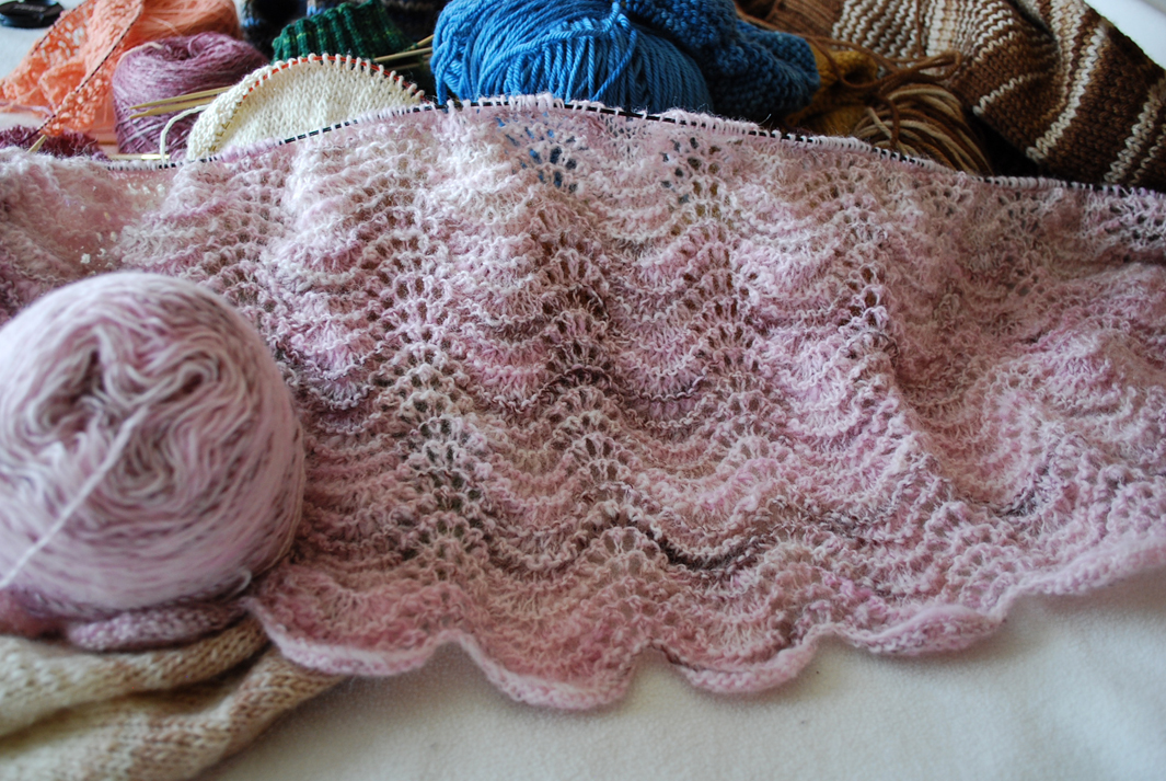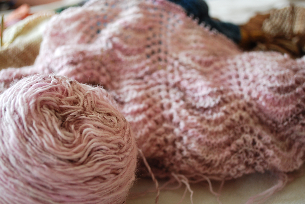I was looking at each project, inspecting the yarn, debating what to do when I picked up the light pink WIP. I do not remember why I put this one down. I was really enjoying my work on it. It is going to be a very simple light weight shawl made just from the feather and fan stitch. The yarn is 100% Shetland wool that I handspun to about a sock weight. I purchased the fiber as a batt from a local farmer that raises the sheep herself. I absolutely love the yarn and am sad I put this one down. I think this one for sure is going to be picked back up and finished. As for the other works in progress? Well, Gabriel might be out of diapers before I get around to finishing that soaker! And you know what? I think I am okay with that.