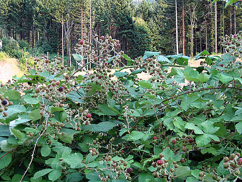 The blackberries are everywhere out here. Sides of roads are blanketed in a thick tangled mess of them. I had never seen anything like it before moving up here. I knew blackberries were very prolific out here but I never could have imagined that they would be this prolific! It makes me think of Sleeping Beauty when the prince had to hack his way through all the thorny branches in order to reach the castle.