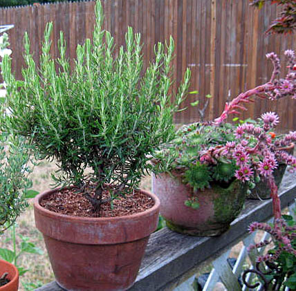 The picture below shows the rosemary and the pot of hens and chicks. It was taken just three days ago.